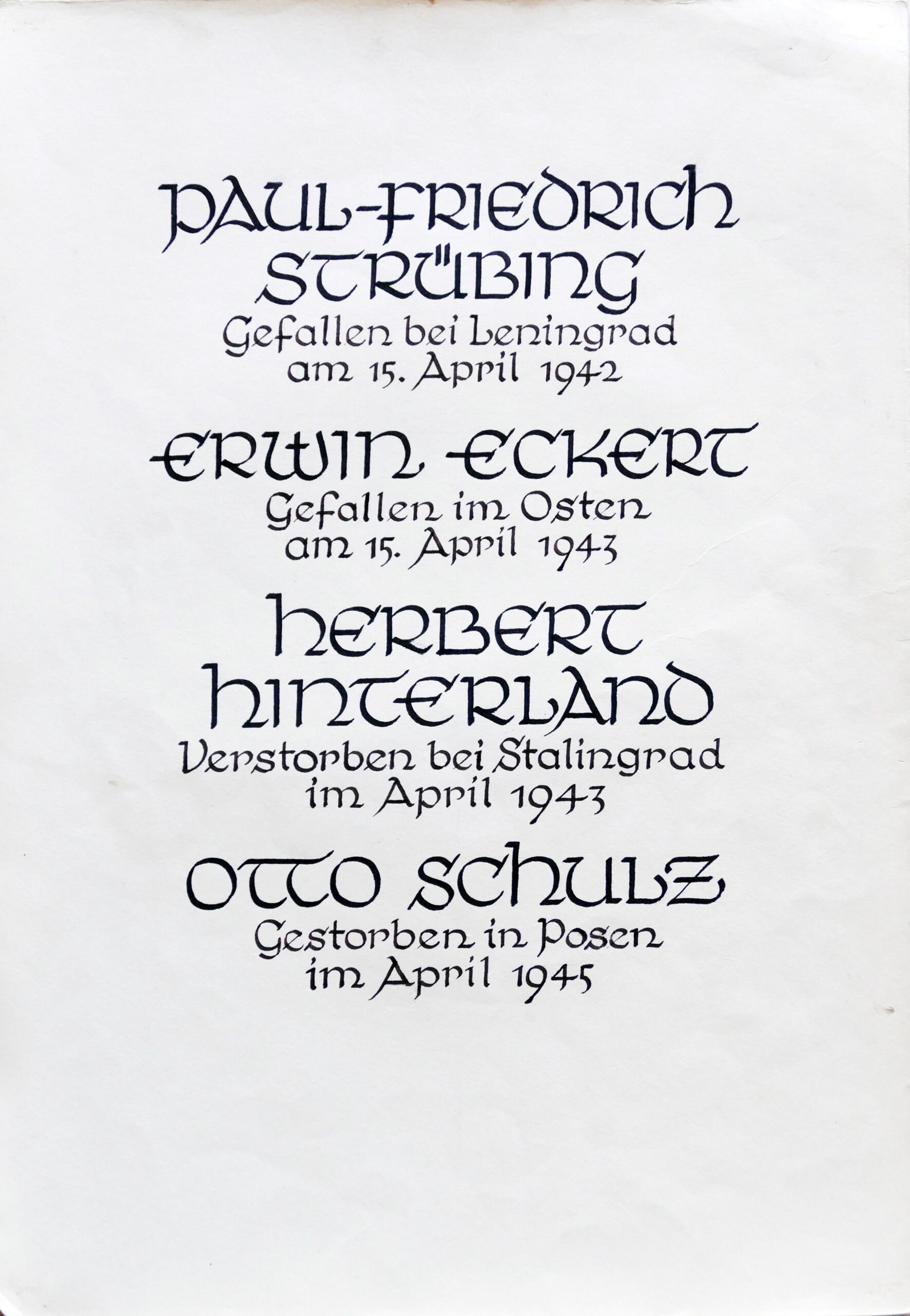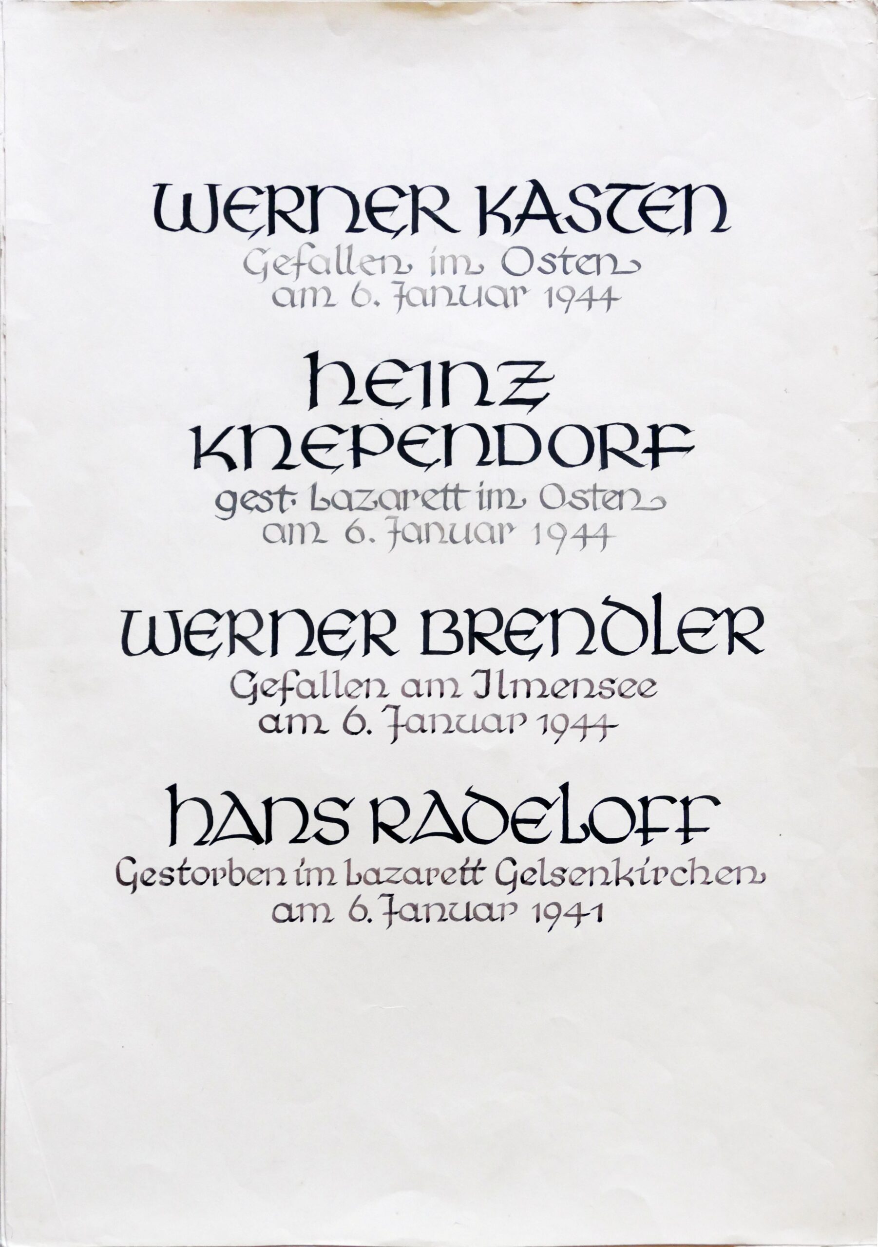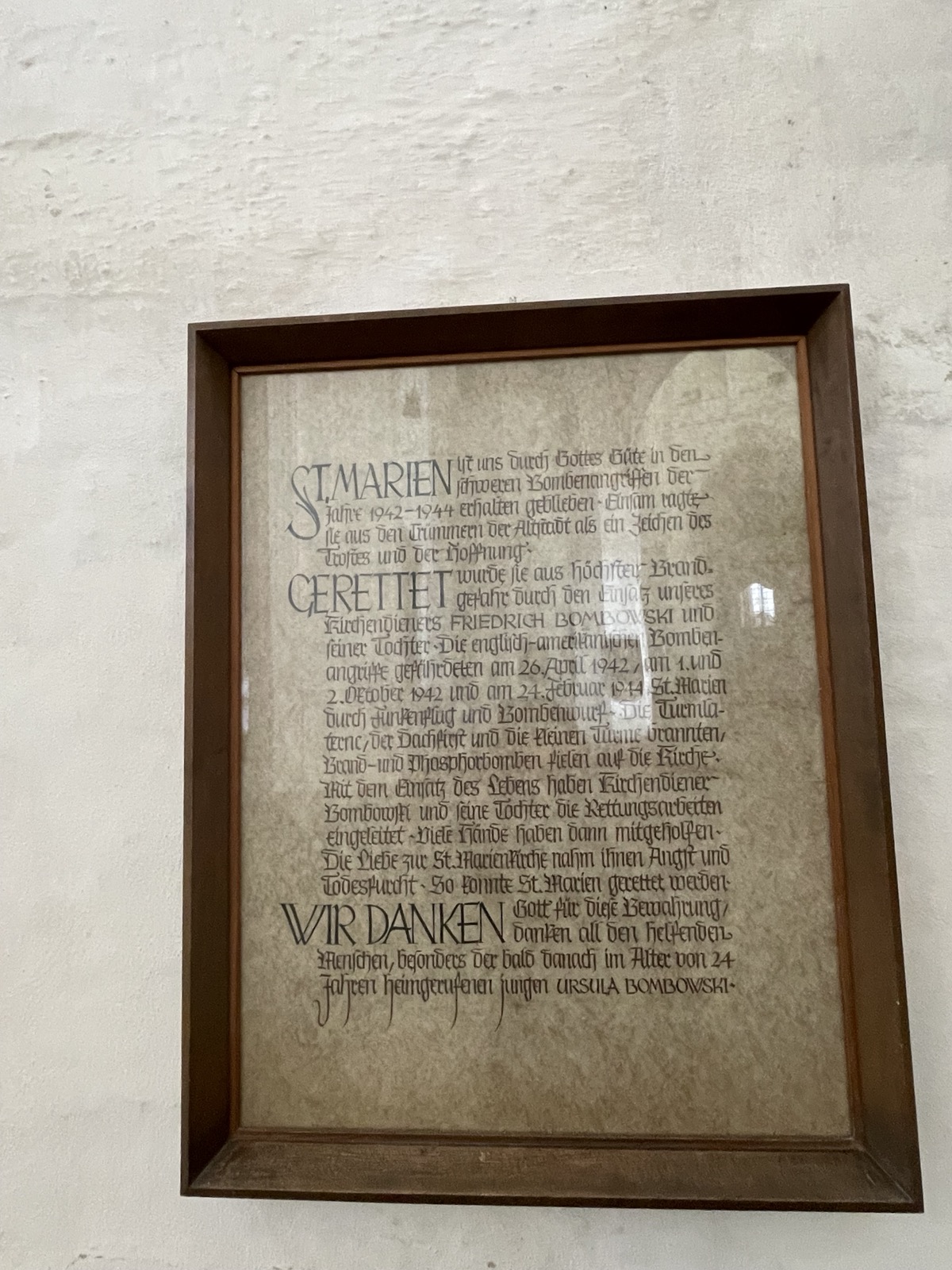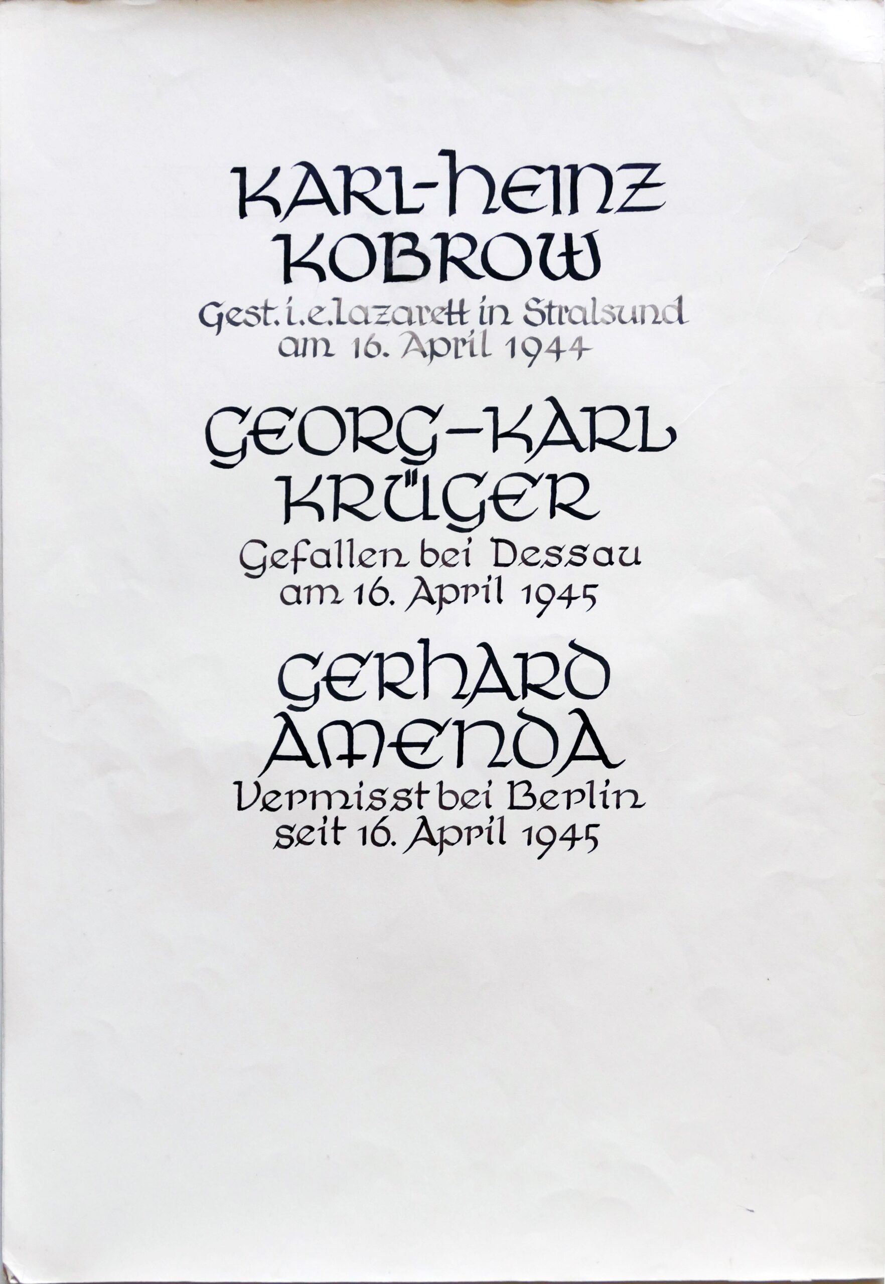 Wir denken auch an die Bombenopfer der Kirchgemeinde, an die aus der Gemeinde Verhafteten und Deportierten, die nicht zurückgekehrten und an die Menschen, die in der Zeit an Hunger oder an kriegsbedingten Krankheiten gestorben sind.