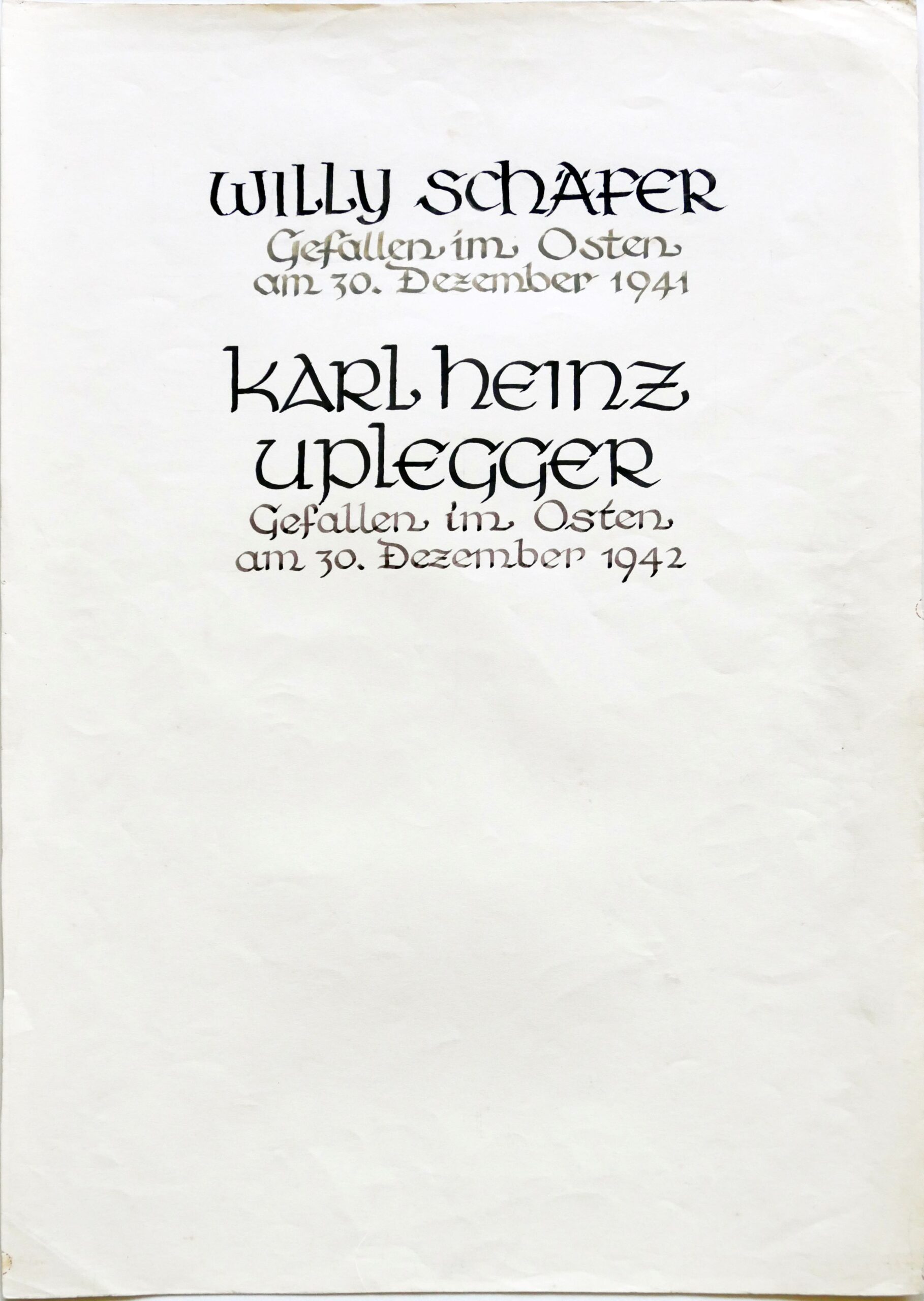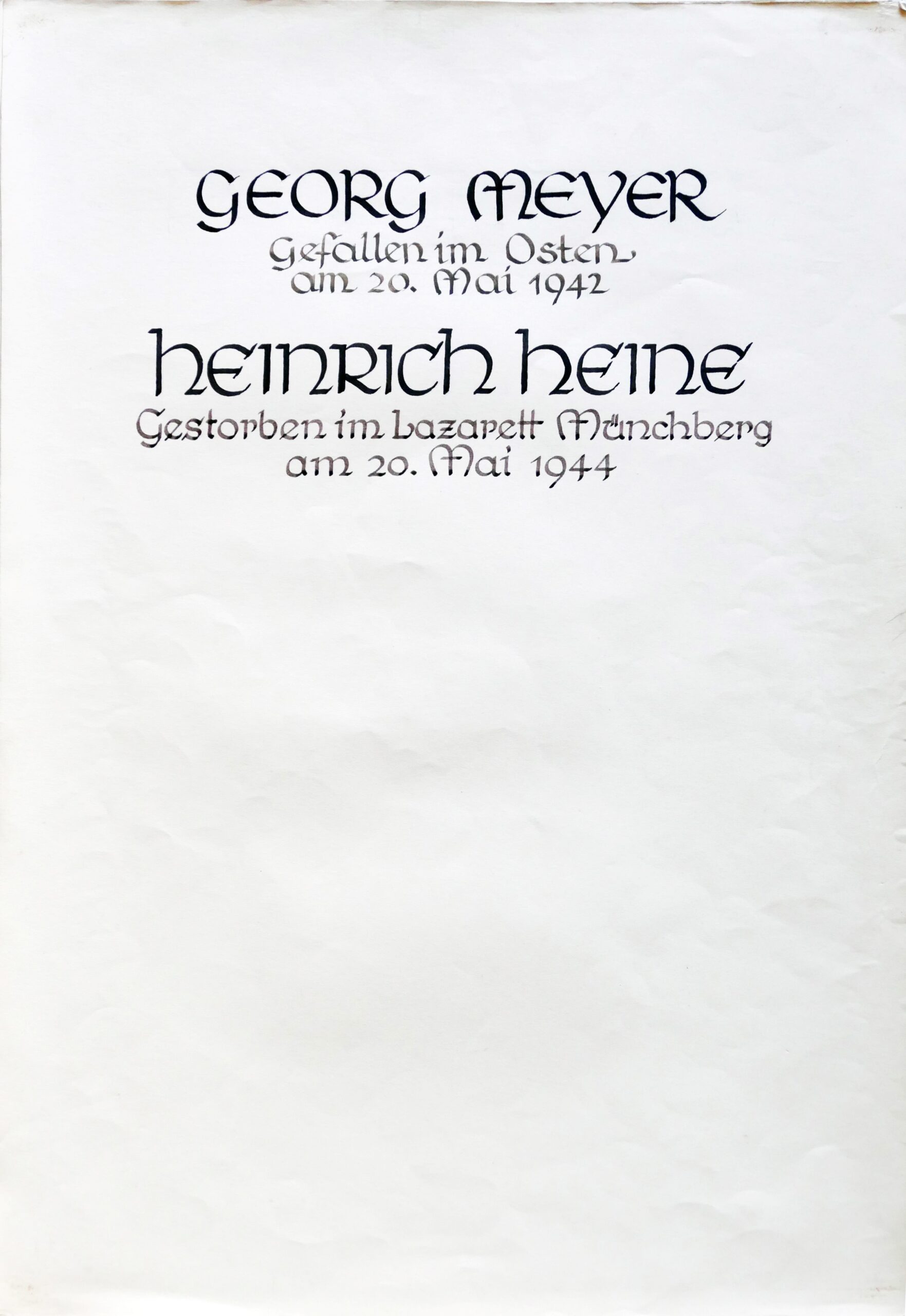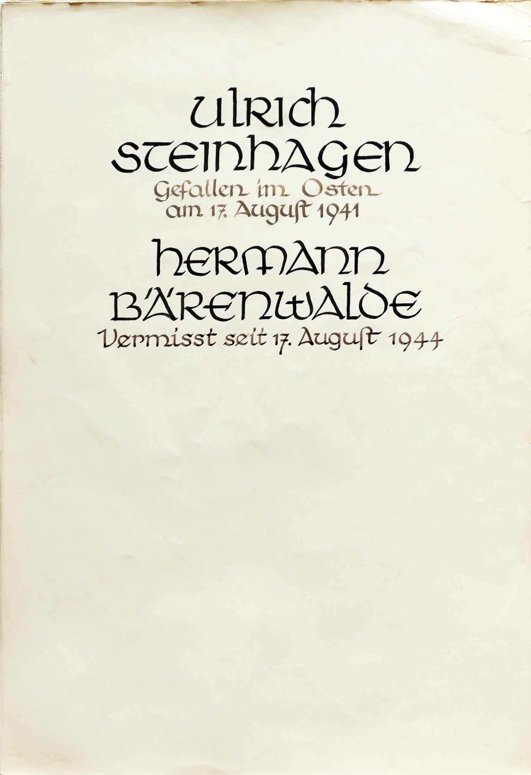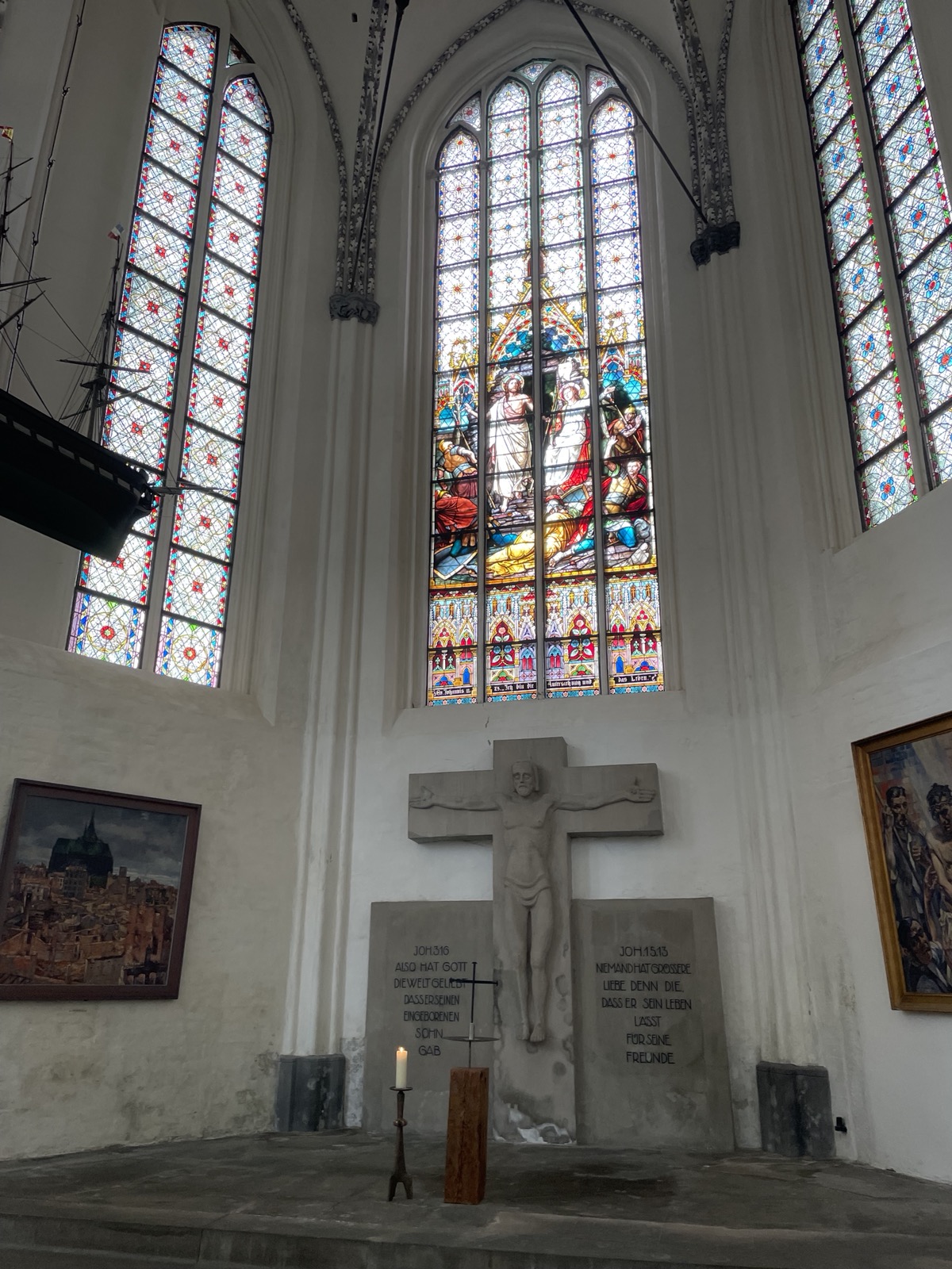 Unterhalb der linken und rechten Seitenfenster waren Steintafeln angebracht, auf denen die Namen von gefallenen Soldaten aus dem 1. Weltkrieg standen. Zur Rekonstruktion dieser Tafeln und dem Namensbuch finden Sie hier weitere Informationen.